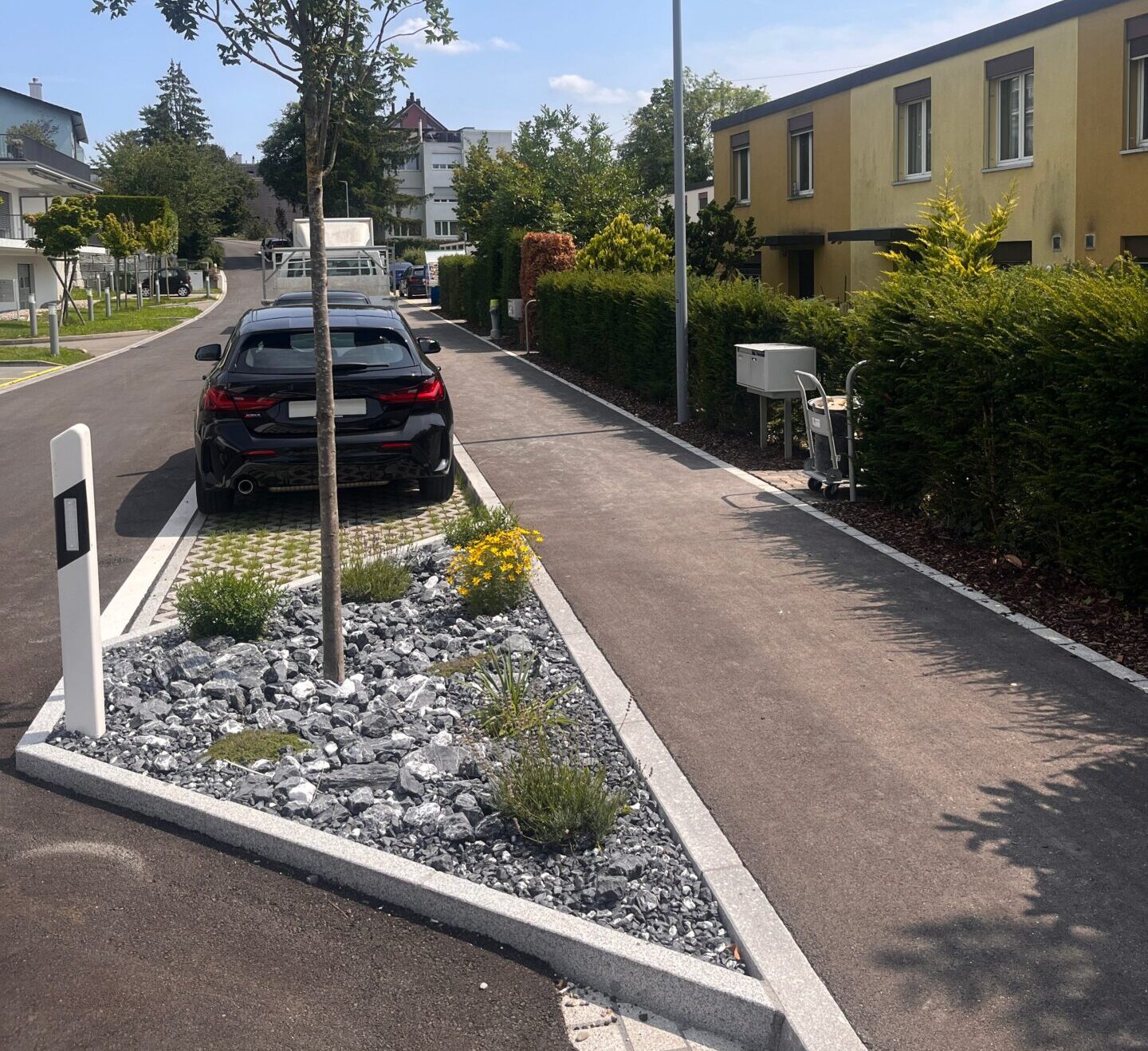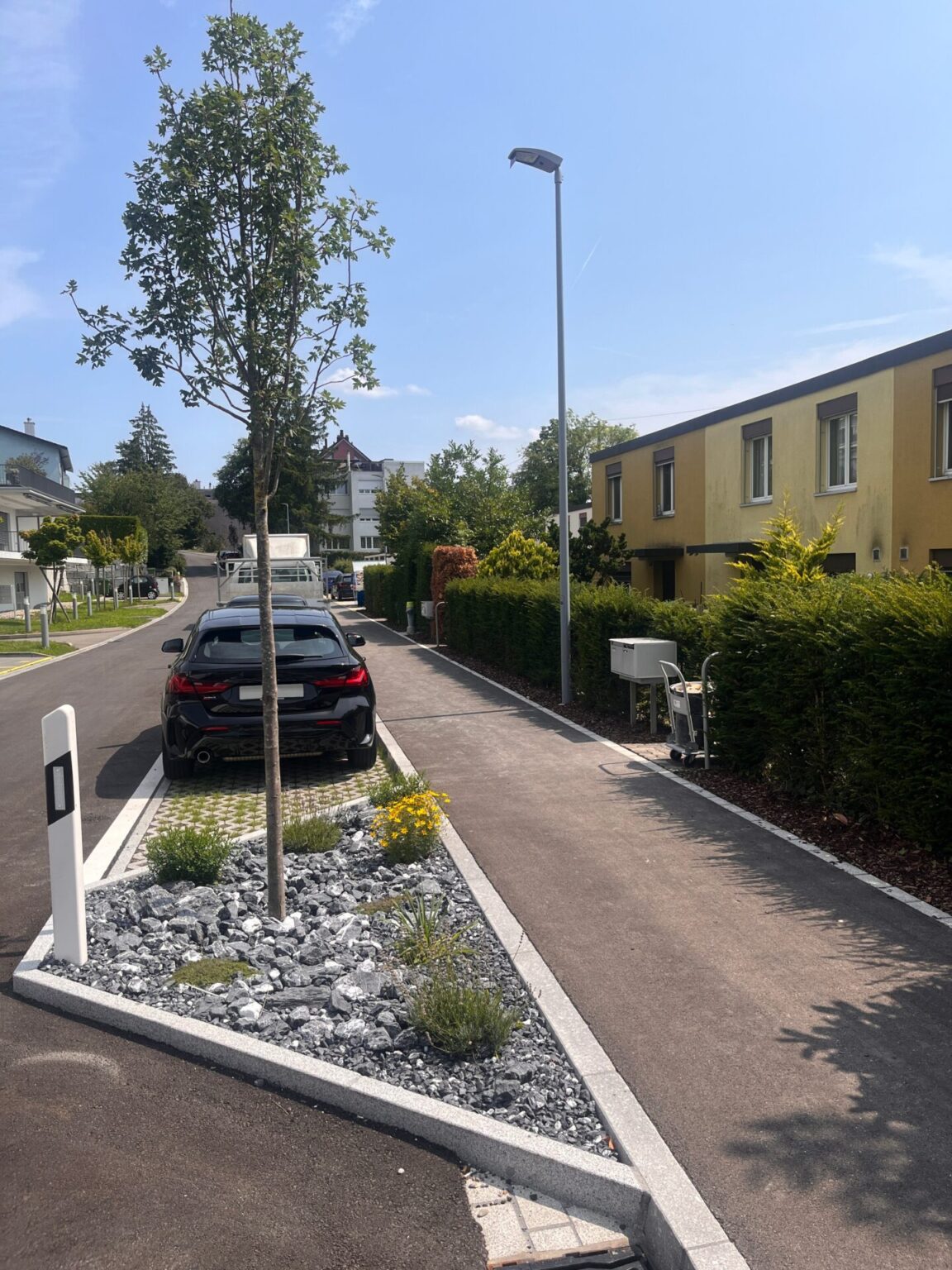 Zur Optimierung zählte einerseits der Ersatz der Strassenbeleuchtung durch moderne LED-Leuchten sowie der Versatz der Kandelaber an optimalere Standorte. Um den Strassenraum aufzuwerten sowie einen Beitrag zur klimaangepassten Siedlungsentwicklung zu leisten, wurden die öffentlichen Parkfelder vom Asphalt befreit und mit Rasengittersteinen versehen. Durch die Rasengittersteine kann das Regenwasserversickern und durch die wachsende Begrünung wird durch Vaporisation der Strassenraum etwas gekühlt.